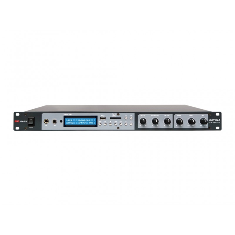 Le MMP 10 AT est un amplificateur rack 1 UH 19" qui intègre un lecteur audio en plusieurs formats et une table de mixage à plusieurs entrées. L'appareil dispose d'une interface USB/SD pour la lecture de fichiers externes, d'une connectivité Bluetooth, d'un tuner radio FM, de commandes de piste avant/ fonction arrière et répétition.Il est possible de connecter d'autres appareils externes grâce aux connecteurs intégrés (MIC+AUX+LINE), il dispose également de 5 préréglages d'égalisation et de 2 commandes de tonalité.MMP 10 AT intègre un amplificateur de 2 x 100 W avec protection contre les surcharges et la température.