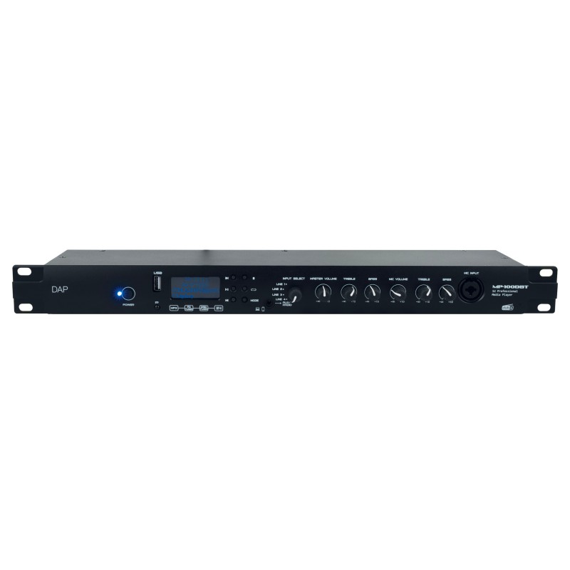 Prise en charge de DAB+, radio FM, USB/MP3 et Bluetooth 4.2. Prise jack 3,5 mm, XLR/micro mixte, USB-A et 4 entrées RCA. Télécommande IR incluse.