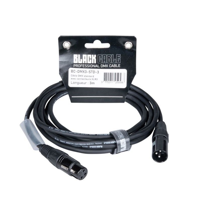 Avec ses gammes variées, BLACK CABLE couvre l’ensemble des besoins essentiels des techniciens, des raccords très courts aux câbles plus longs. Le BC-DMX3-STD-3 correspond à cette logique avec une longueur de 3 m. Sa structure comprend deux conducteurs en cuivre assemblés symétriquement et protégés par un blindage, garantissant une transmission stable du signal DMX-512. La gaine en PVC souple apporte une bonne flexibilité et résiste aux usages répétés, facilitant le déroulement et l’enroulement. Sa taille intermédiaire en fait une solution pratique pour de nombreuses configurations de proximité.