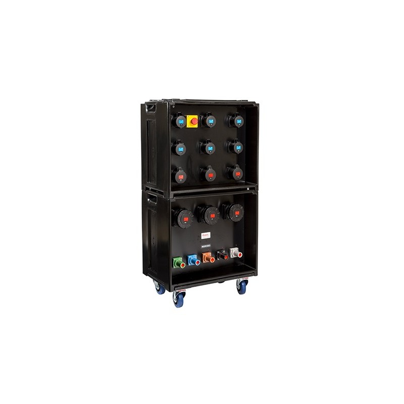 Entrées : Powerlock 3P+N+T. Sorties : 3 x P17 63A 5p, 3 x P17 32A 5p, 6 x P17 32A 3p. Protec : disj 4P 250A, disj 4P 63A 30mA, disj 4P 32A 30mA, disj P+N 32A 30mA. Plateau à roulette en option L.