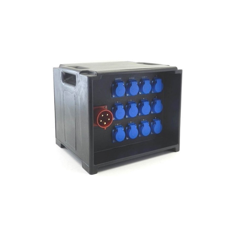 + FABRIQUE EN EUROPE Entrée : embase noire P17 63A 5p. Sorties : 12 embases noires P17 16A 3p. Protection : disjoncteur principal 4P 63A avec différentiel 30 mA, disjoncteurs P+N 16A. Plateau à roulette en option S. Entrée ''In'' Alimentation : P17 63 A Tétrapolaire Sortie ''Out'' Alimentation : P17 16 A Monophasé Poids (net) : 25 kg Dimensions (hors...