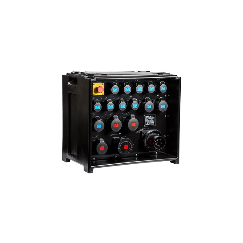 Entrée : P17 125A 5p. Sorties : P17 63A 5p, 3 x P17 32A 5p, 3 x P17 32A 3p, 9 x P17 16A 3p. Protec : disj 4P 125A, disj 4P 63A 30mA, disj 4P 32A 30mA, disj P+N 32A 30mA. Plateau à roulette M.